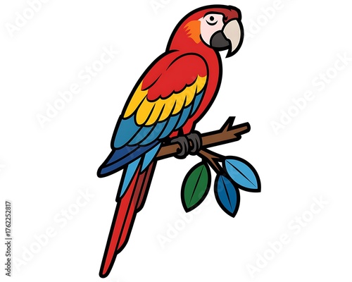 © Humaira Gfx, Fototapeta premium Colorful scarlet macaw parrot perched on a branch with green leaves