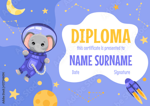 Fototapeta premium Colorful school and preschool diploma certificate for kids and children in kindergarten or primary grades with cute animals. Vector cartoon illustration