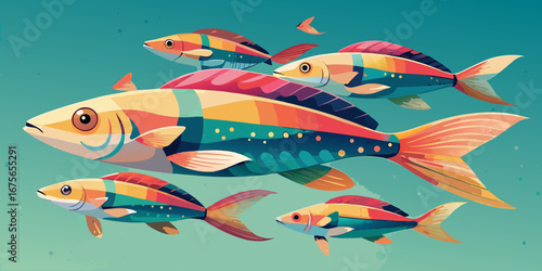 Fototapeta premium Colorful School of Fish Swimming in the Ocean Abstract Illustration with Vibrant Colors and Geometric Shapes Aquatic Life and Underwater Scene