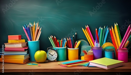 © Jeremy, Obraz premium colorful school stationery on table on blackboard background ai generated illustration
