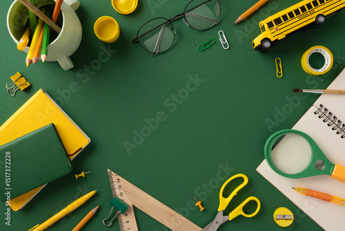 © ActionGP, Obraz premium Colorful school supplies and stationery organized on a desk, perfect for back-to-school themes