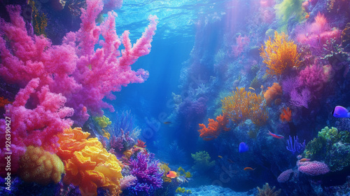 Naklejka premium Colorful sea life surrounds vibrant coral formations. --ar 16:9 --v 6.1 Job ID: 5ba6e96c-332d-4411-a005-1db2af9b7d9b