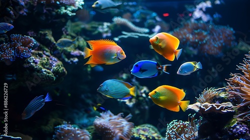 Fototapeta premium Colorful sea underwater fish in coral reef Aquarium with panoramic view of...
