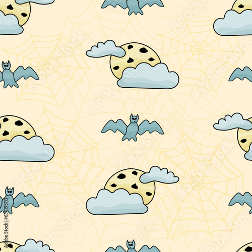Naklejka premium Colorful seamless pattern with hand drawn doodle cute Halloween character and objects - cartoon bat, moon with clouds and spider web