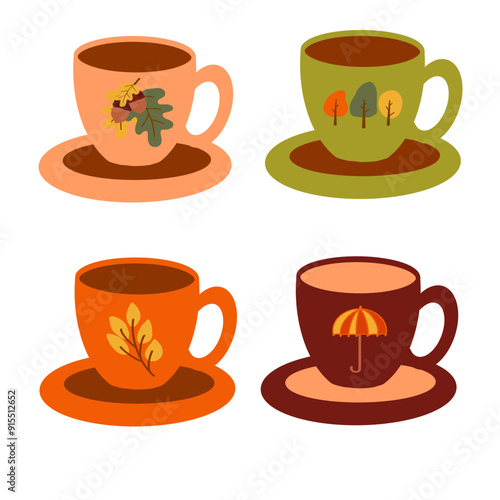 © nataluna, Obraz premium Colorful seasonal cups on saucers featuring different nature designs during autumn