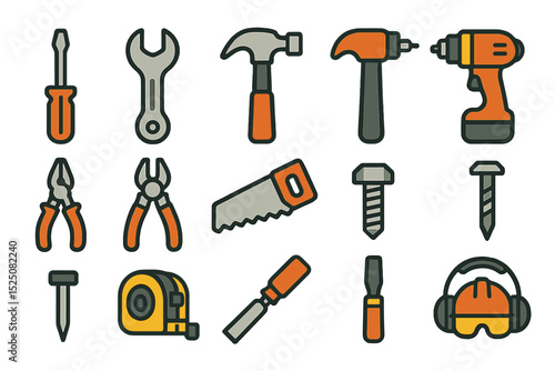 Fototapeta premium Colorful set of hand tools and construction equipment icons on yellow background