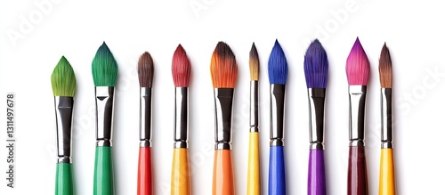 © Rufat, Obraz premium Colorful set of paintbrushes arranged horizontally on a white background featuring green red orange yellow purple and blue bristles top view angle