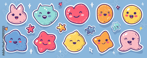 Fototapeta premium Colorful set of smiling face labels and retro sticker shapes, featuring funny...
