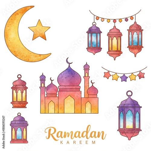© Moyassar, Fototapeta premium Colorful set of watercolor Ramadan lanterns and mosque design elements stickers