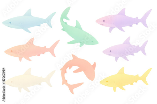© King558, Obraz premium Colorful shark silhouettes icons set – vibrant sea life, simple designs. Flat icon set