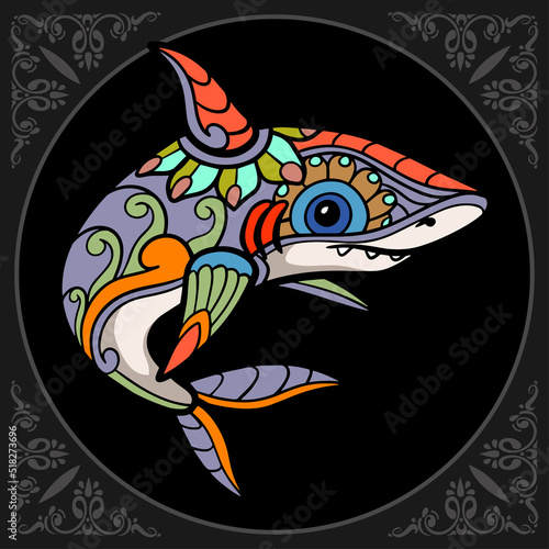 © REYYARTS, Naklejka premium Colorful shark zentangle arts isolated on black background.