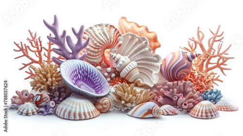 Obraz premium Colorful shells isolated on white background, underwater background, style 3D