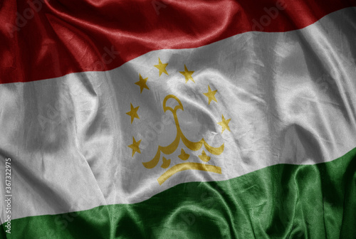 Fototapeta premium colorful shining big national flag of tajikistan on a silky texture