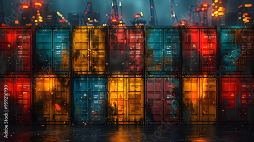 © KALEYA, Fototapeta premium Colorful Shipping Containers at Night - 3D Illustration