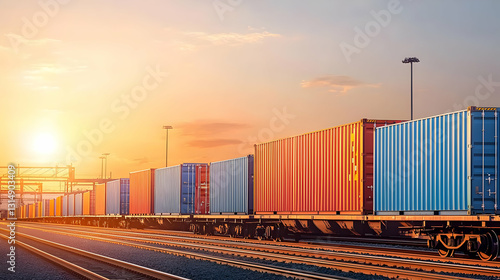 Fototapeta premium Colorful Shipping Containers On Freight Train At Sunset
