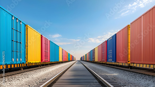© artzone, Fototapeta premium Colorful Shipping Containers Train On Railroad Tracks