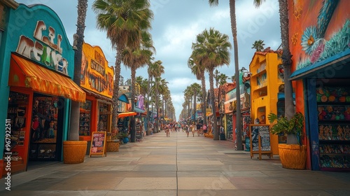 Naklejka premium Colorful shopping street lined with palm trees and vibrant storefronts.