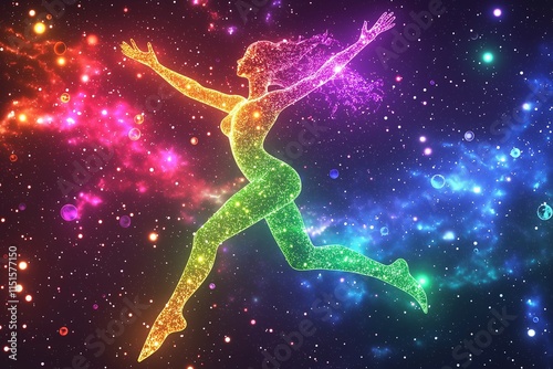 Fototapeta premium Colorful silhouette of a woman surrounded by vibrant cosmic energy at night