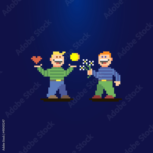Fototapeta premium colorful simple flat pixel art illustration of two smiling guys. one boy has a heart and a coin in his hands, and another boy is holding a bouquet of flowers