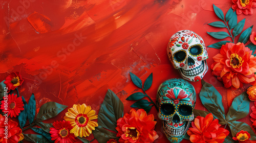 © Aliona Manakova, Naklejka premium Colorful skulls and flowers frame over red background with copy space