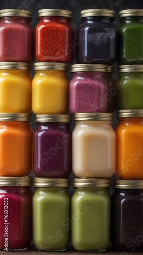 © LoFi J., Naklejka premium Colorful Smoothie Bottles with Fresh Fruits and Vegetables.