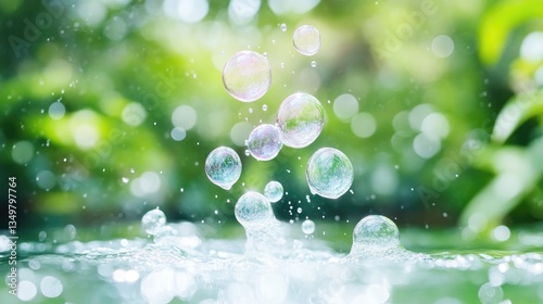 Obraz premium Colorful soap bubbles popping in water, vibrant green background