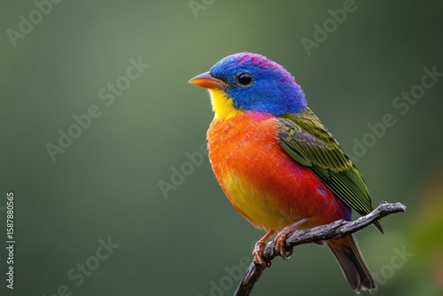 © HO, Obraz premium Colorful songbird profile, painted bunting facing left, minimal background