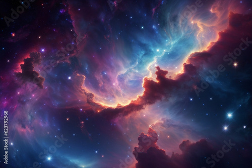 Fototapeta premium Colorful space galaxy cloud nebula. Stary night cosmos. Universe science astronomy. Supernova background wallpaper. Generative Al