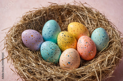 Fototapeta premium Colorful speckled Easter eggs arranged in a soft nest of hay on a pastel...