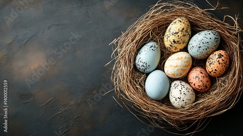© Ascents, Obraz premium Colorful speckled eggs nestled in a rustic bird's nest on a dark surface.
