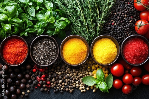 Fototapeta premium Colorful spices and herbs creating a culinary masterpiece on dark background