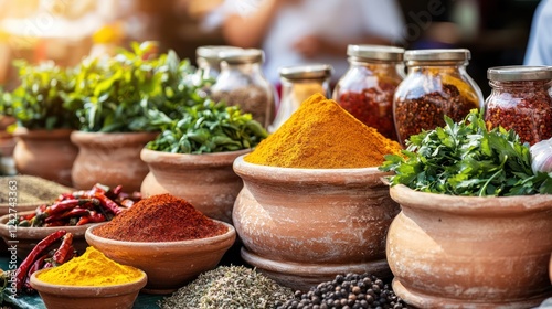 © Mochamad, Fototapeta premium Colorful spices and herbs displayed in pots at a market for culinary use.
