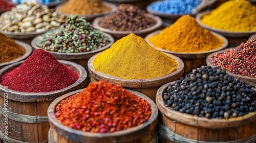 © พุฒิพงศ์ ขาวทอง, Fototapeta premium Colorful Spices in Wooden Bowls at a Market
