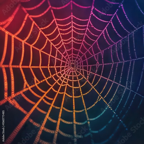© walaiporn, Obraz premium Colorful spider web with intricate patterns, dark background.