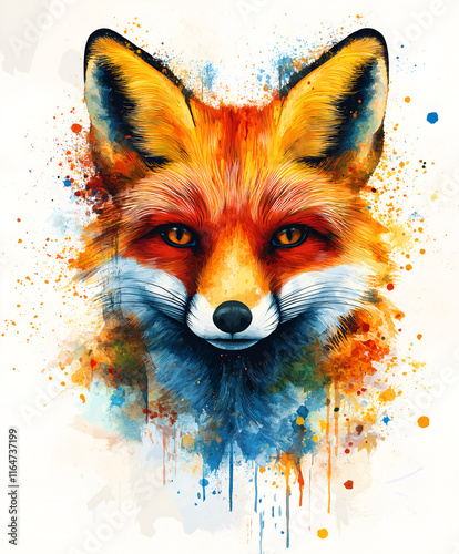 © Krisz G, Obraz premium Colorful splash art of a fox face, isolated on white background