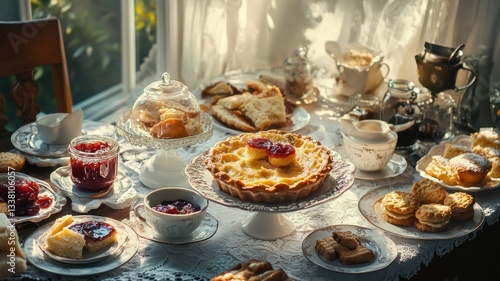 Naklejka premium Colorful spread of pudding, jam, and biscuits in a bright, sunlit kitchen...