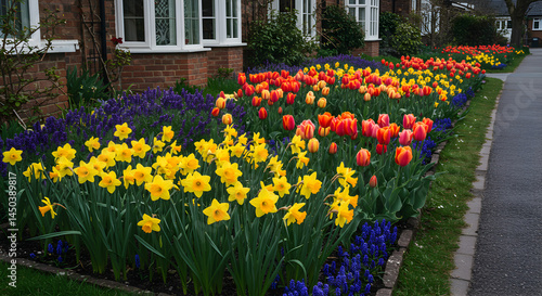 © Rita, Fototapeta premium Colorful Spring Flowerbed Near Suburban House Displaying Daffodils And Tulips