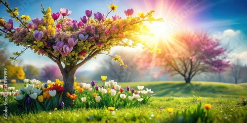 Fototapeta premium Colorful spring flowers bloom under sunny sky on lush green grass near a blooming tree in heart shape, nature scene, spring flowers