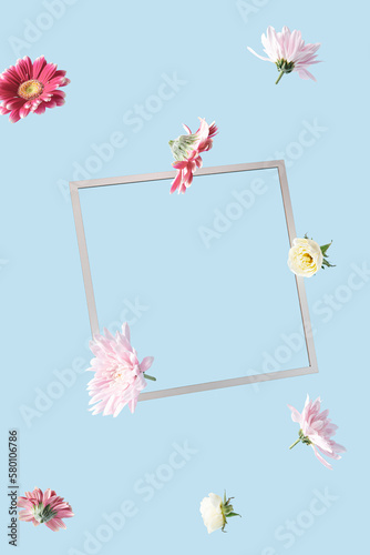 Obraz premium Colorful spring flowers flying with frame. Copy space for text on a blue background. Florist arrangement concept.