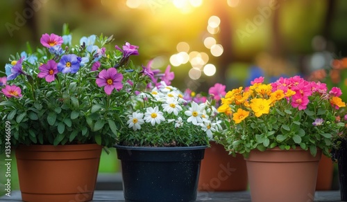 © letter, Fototapeta premium Colorful Spring Flowers in Pots on a Wooden Table with Gardening Tools in a Beautiful Garden