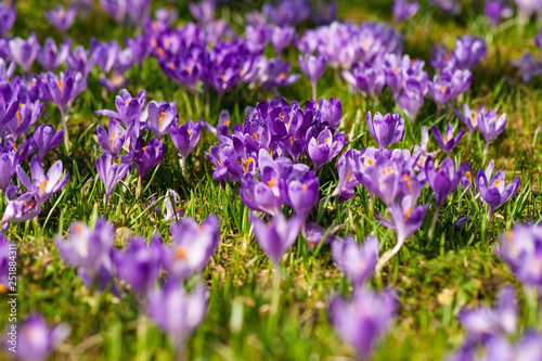 © Viktoria, Naklejka premium Colorful spring landscape in Carpathiands with fields of blooming crocuses. Purple Saffron blossoms on a bright sunny day in the pasture. View of blooming Crocuses on a Meadow.