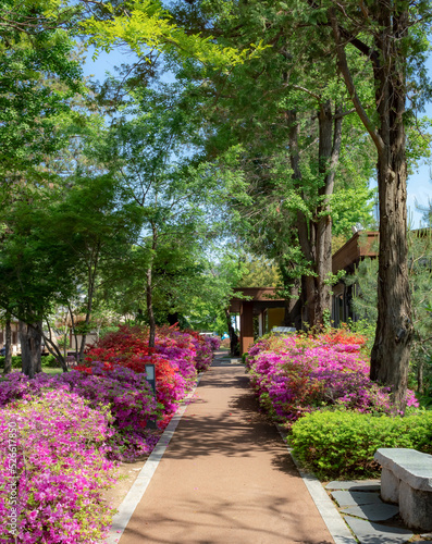 Fototapeta premium Colorful spring pink flowers and green garden at Gyeongbokgung palace in...