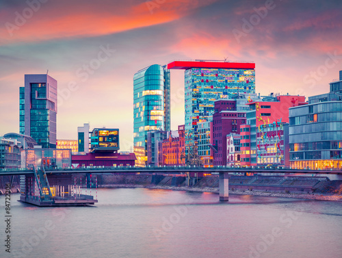 Fototapeta premium Colorful spring sunset on Rhine river in Dusseldorf.