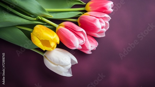 Obraz premium Colorful spring tulips laid on a deep purple surface, representing freshness...
