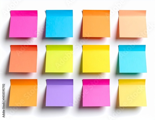 Fototapeta premium Colorful square sticky notes arranged in rows against a white backdrop, ready...