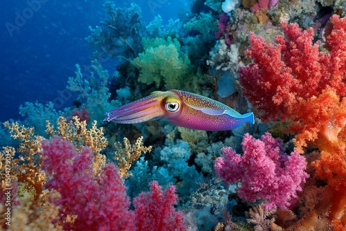 Fototapeta premium Colorful squid swims among vibrant coral reef in crystal clear water