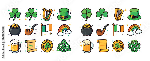 Fototapeta premium Colorful st. patrick's day icons featuring shamrocks harps and irish flags