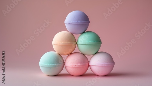 Fototapeta premium Colorful stacked bath bombs in pastel shades arranged on a soft pink background