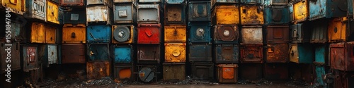 Naklejka premium Colorful stacked industrial containers in an urban setting.