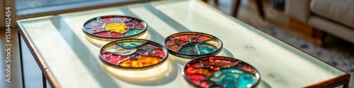 © Beniamin, Naklejka premium Colorful stained glass coasters on sunlit table in cozy setting